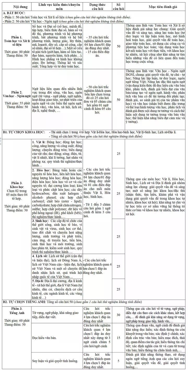 Bài thi đánh giá năng lực được thiết kế theo hướng kiểm tra tổng hợp khả năng tư duy và kiến thức của thí sinh. Tổng điểm tối đa của bài thi là 150 điểm, chia đều cho ba phần thi.