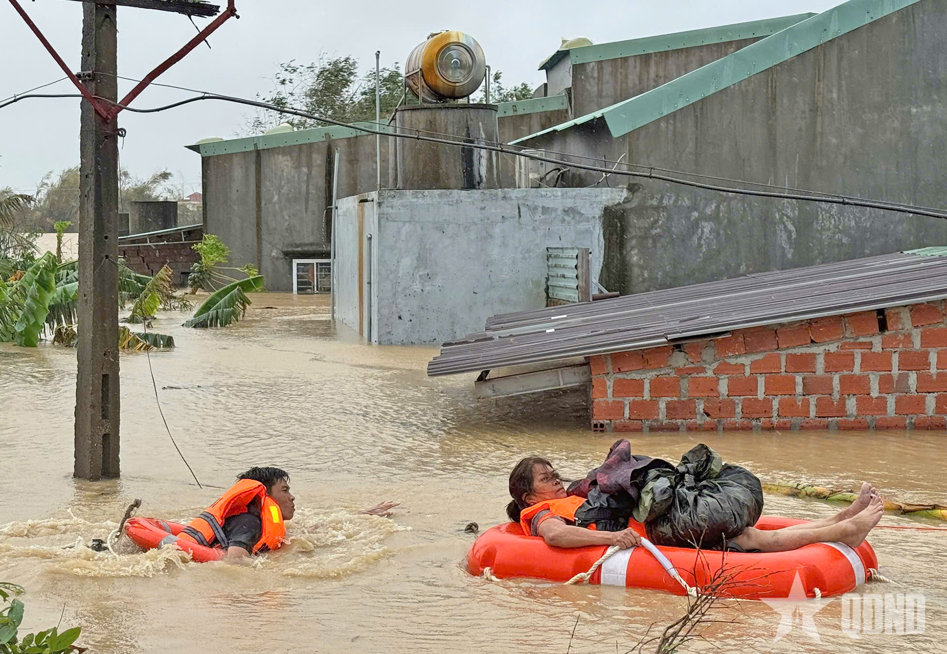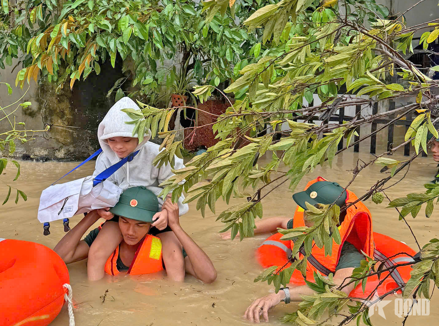 Cán bộ, chiến sĩ, học viên Trường Quân sự Quân đoàn 34 tiếp cận những nơi ngập lụt sâu, ứng cứu và đưa người dân đến nơi an toàn.