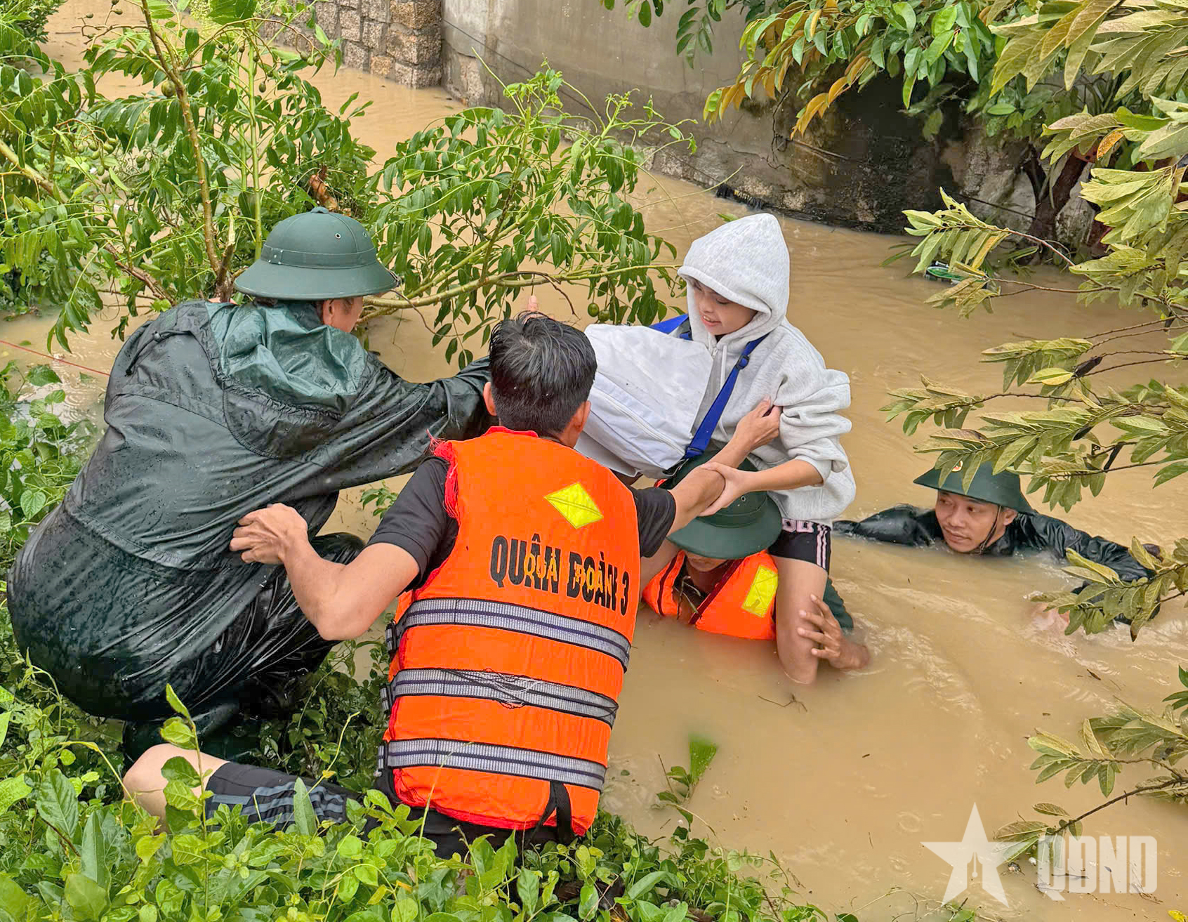 Cán bộ, chiến sĩ, học viên Trường Quân sự Quân đoàn 34 ứng cứu người dân.