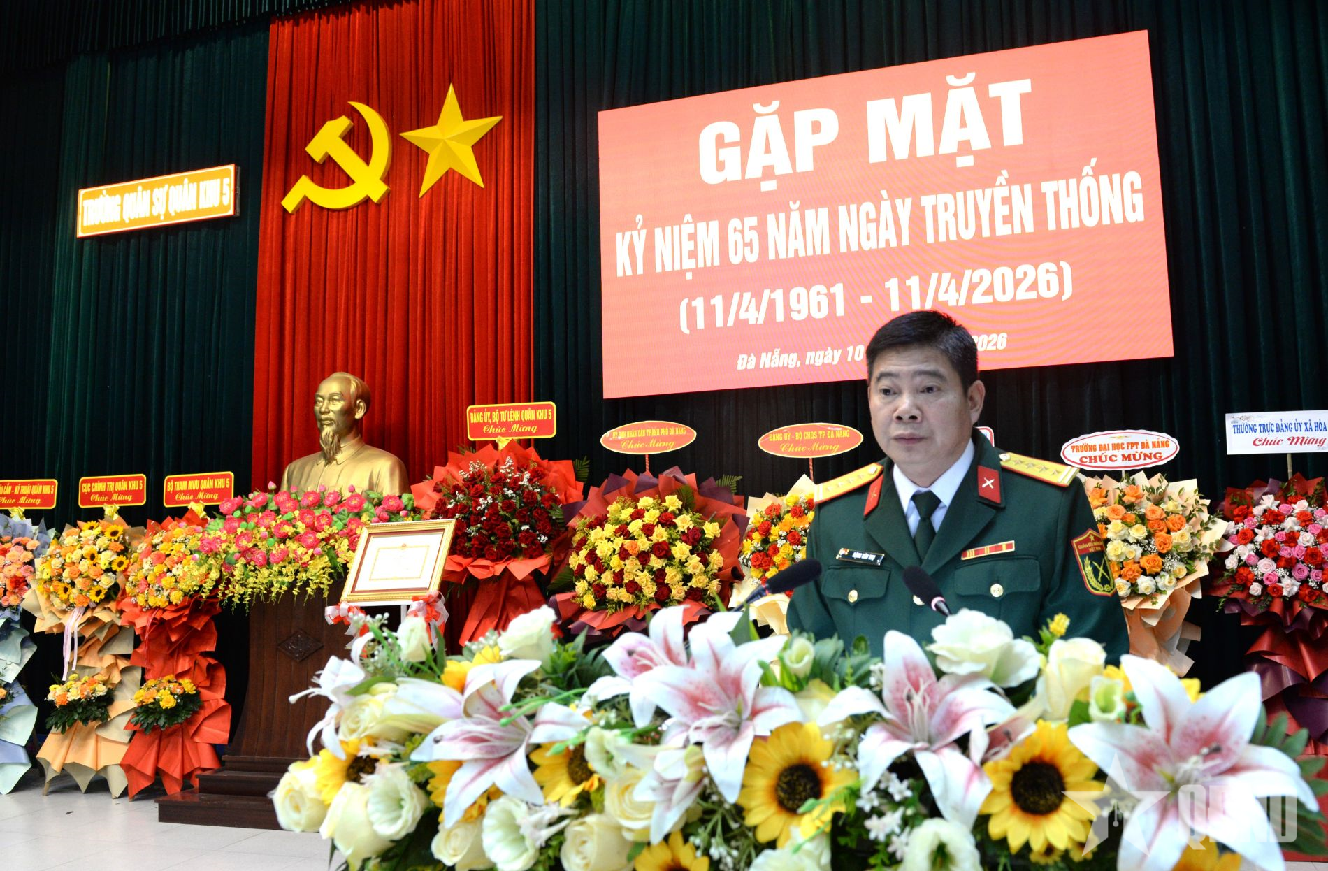 Đại tá Huỳnh Đôn, Hiệu trưởng Trường Quân sự Quân khu 5 trình bày diễn văn kỷ niệm 65 năm Ngày truyền thống Nhà trường.