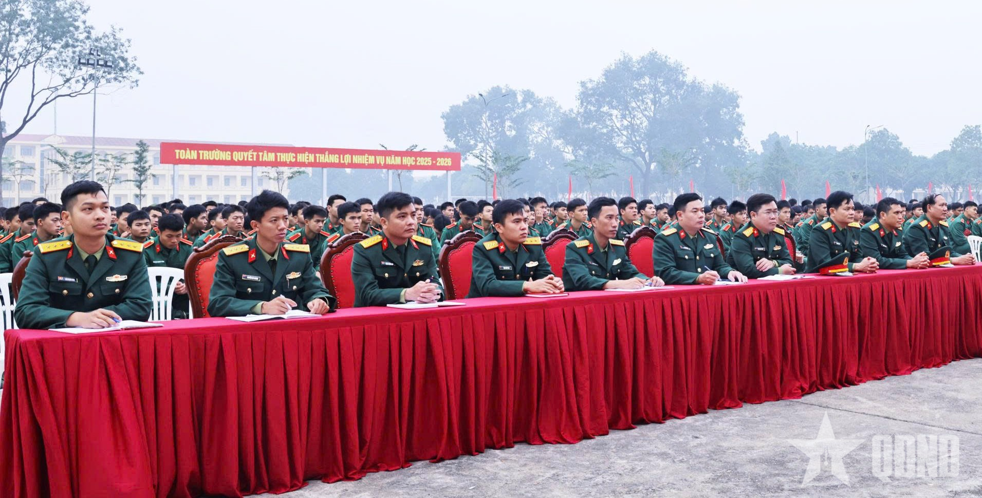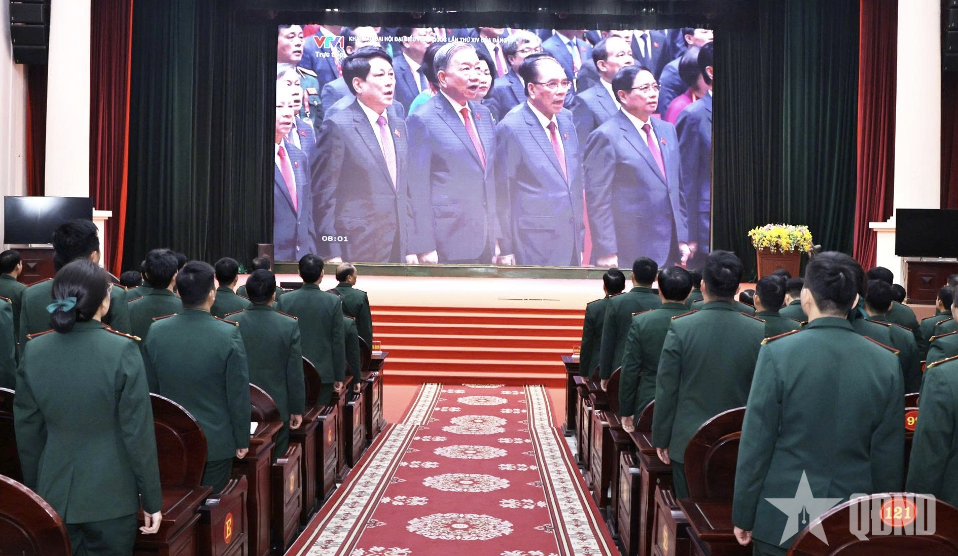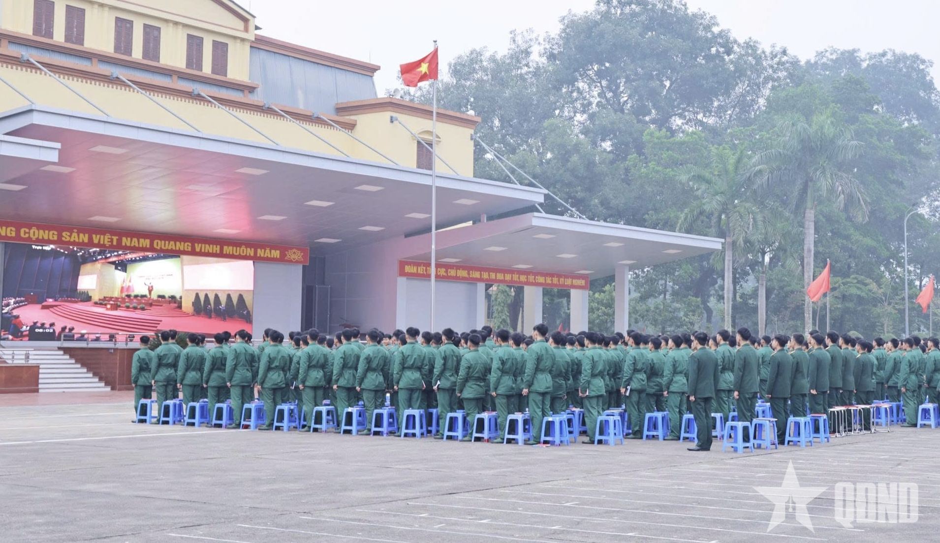 Cán bộ, học viên khối đơn vị xem truyền hình trực tiếp phiên khai mạc Đại hội đại biểu toàn quốc lần thứ XIV của Đảng tại sân vận động của Nhà trường.