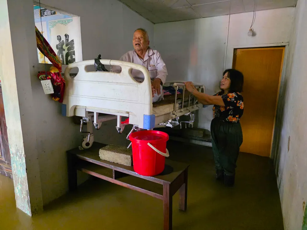 Chiếc giường của ông Phạm Ố được con dâu kê cao lên đến 1,5 m nhưng lúc nước lũ lên cao cũng mấp mé giường. Ông bị mù nên mọi việc phải nhờ đến con dâu chăm sóc nên những ngày lũ này còn vất vả hơn nhiều.