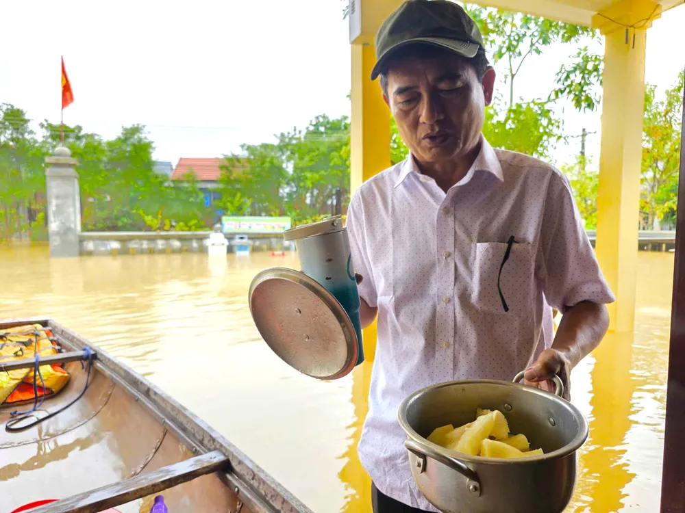 Ông Hà mỉm cười và cho biết đó là quà cứu trợ dân đang ngập lũ. Ông không dám ăn của dân, sợ dân không đủ nên chỉ ăn sắn mình mang theo. “Bà con đang đói, mình ăn của bà con rứa răng được anh. Hết lũ mình đi mua đồ về nấu ăn sau cũng được. Chớ đụng vô đồ cứu trợ tội lắm. Cái tâm của mình không phép đâu”, ông Phạm Văn Hà tâm sự.