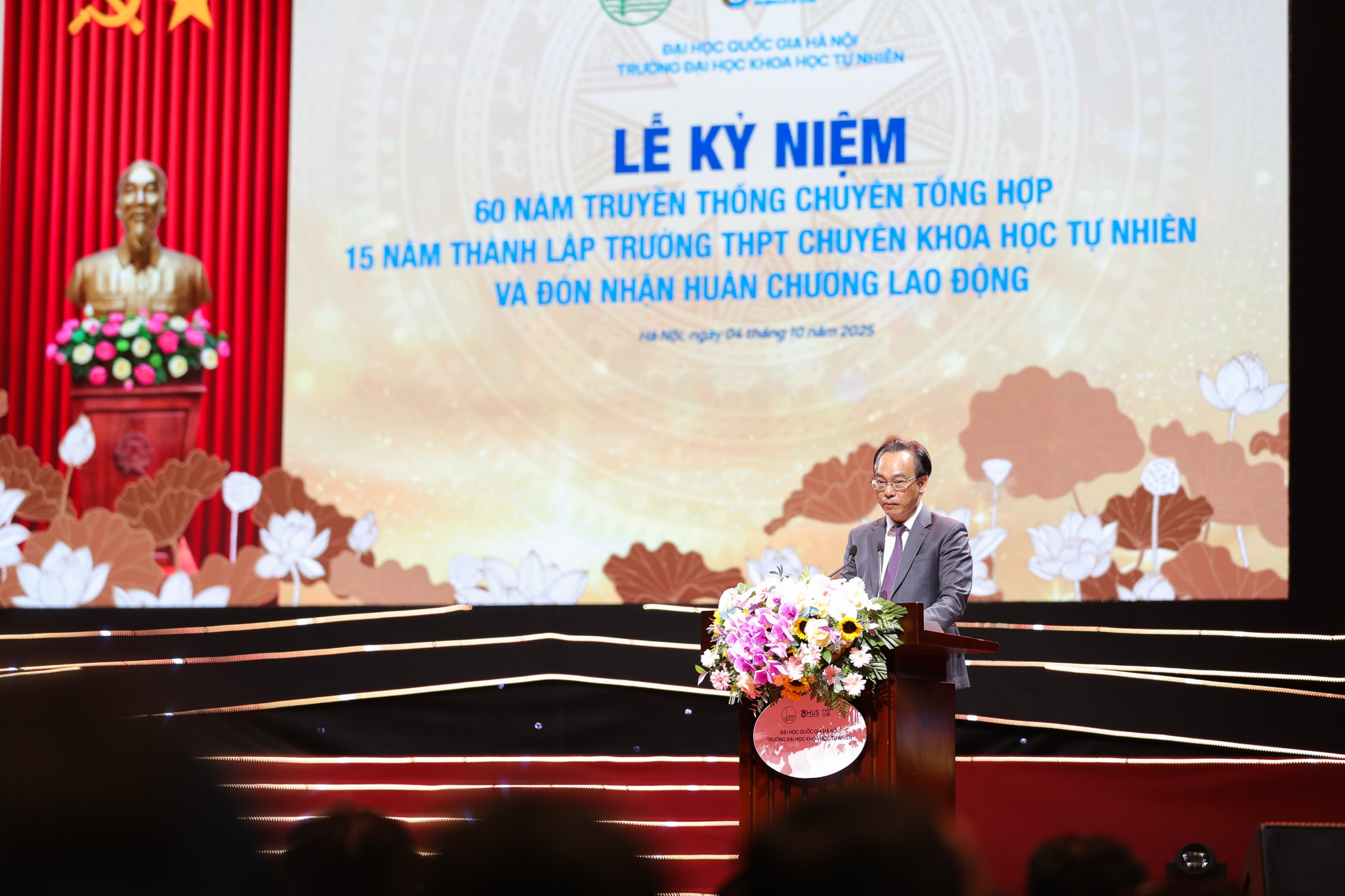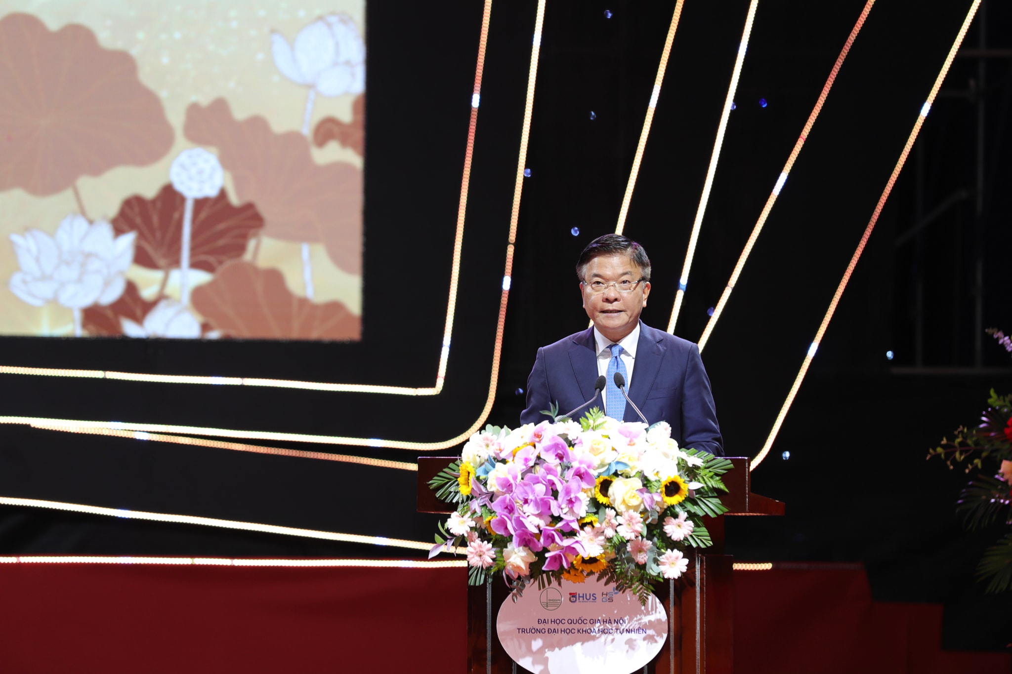 Phát biểu tại buổi lễ, Giám đốc ĐHQGHN Hoàng Minh Sơn bày tỏ sự tự hào khi cùng các thế hệ thầy cô, học sinh và phụ huynh ôn lại chặng đường 60 năm hình thành và phát triển của Chuyên Tổng hợp – 15 năm thành lập Trường THPT Chuyên Khoa học Tự nhiên.