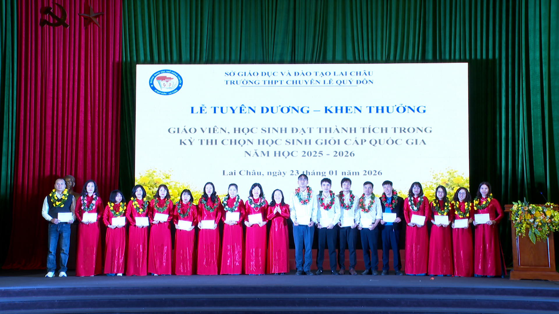 Tại buổi lễ, Trường THPT Chuyên Lê Quý Đôn khen thưởng 18 giáo viên có học sinh đoạt giải tại Kỳ thi chọn học sinh giỏi quốc gia. Các giáo viên được khen thưởng thuộc các môn Lịch sử, Ngữ văn, Hóa học, Vật lý, Địa lý và Sinh học, là những môn có học sinh đạt thành tích tại kỳ thi năm học 2025–2026.