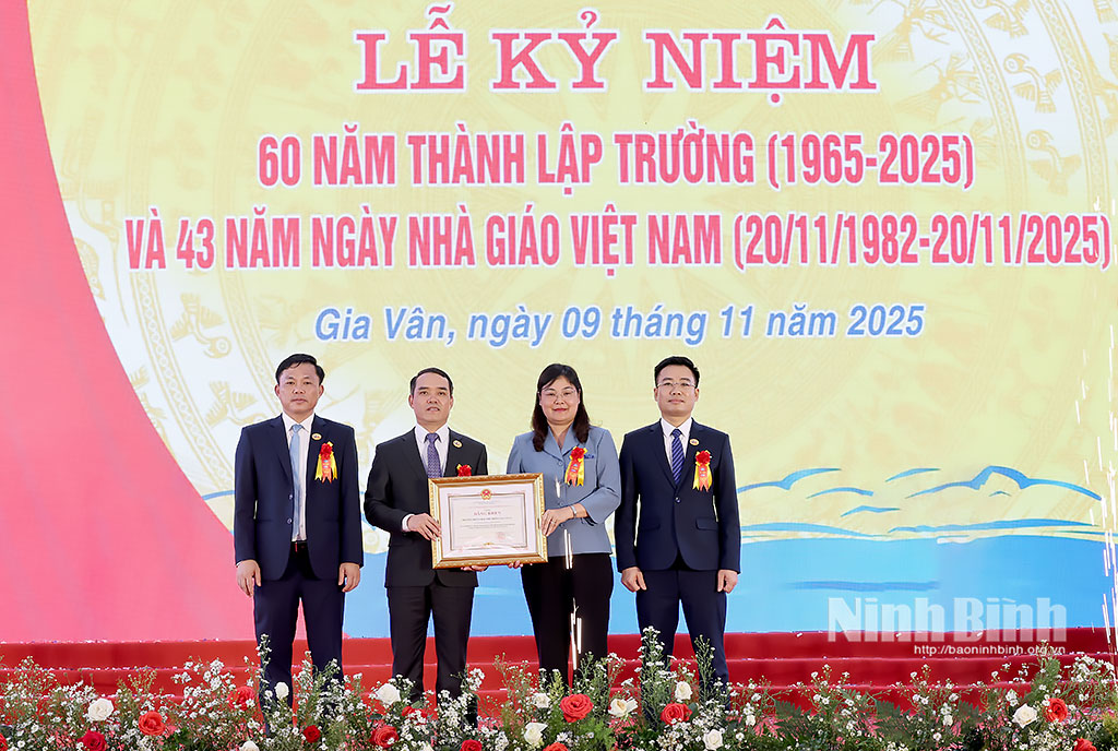 Đồng chí Hà Lan Anh, Tỉnh ủy viên, Phó Chủ tịch UBND tỉnh trao Bằng khen của Chủ tịch UBND tỉnh cho Trường THPT Gia Viễn B đã có thành tích xuất sắc nhân dịp kỷ niệm 60 năm thành lập trường.