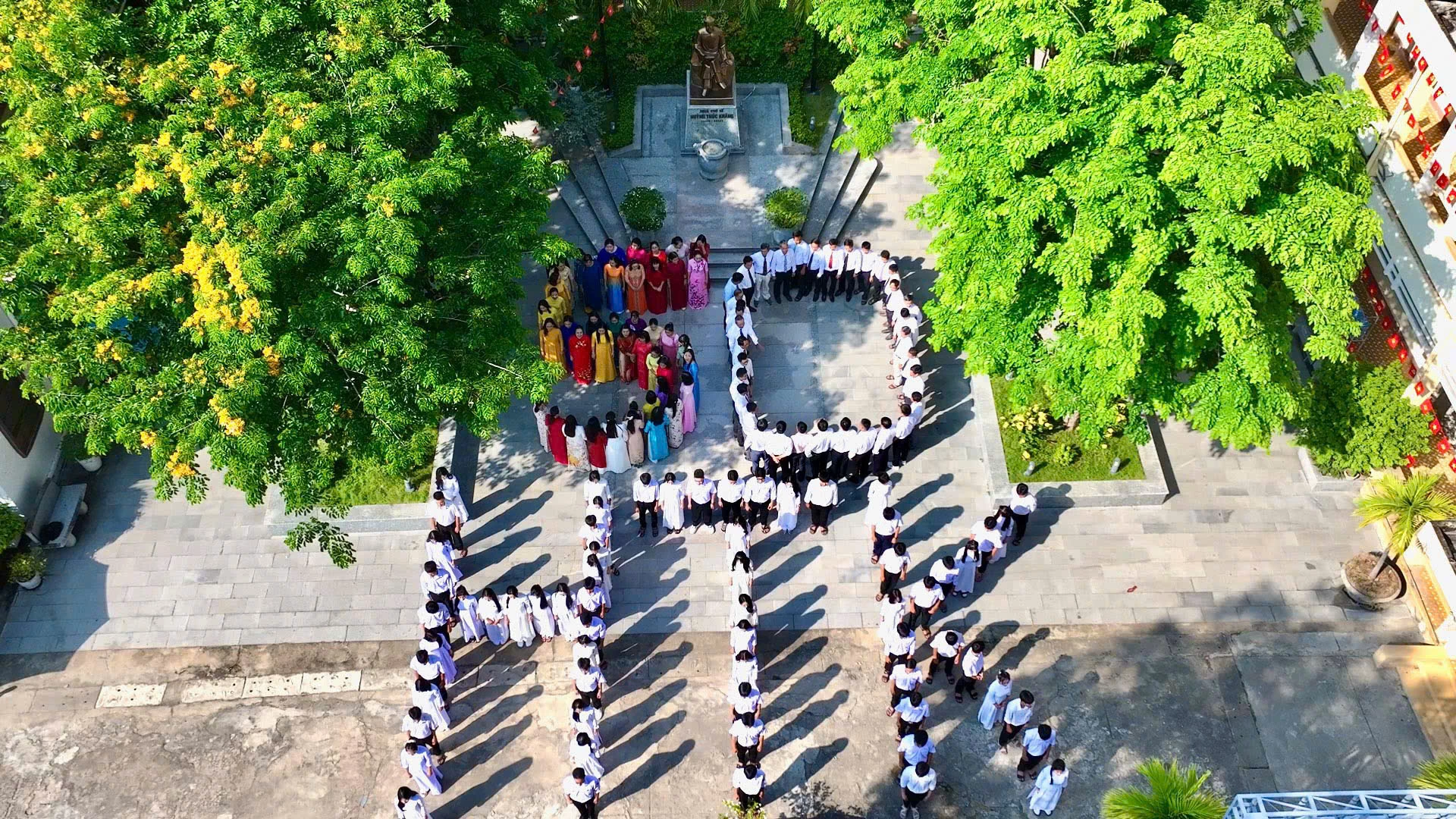 Ban giám hiệu, giáo viên và học sinh Trường THPT Huỳnh Thúc Kháng xếp hình kỷ niệm 50 năm ngày thành lập trước công trình Tượng đài cụ Huỳnh Thúc Kháng.