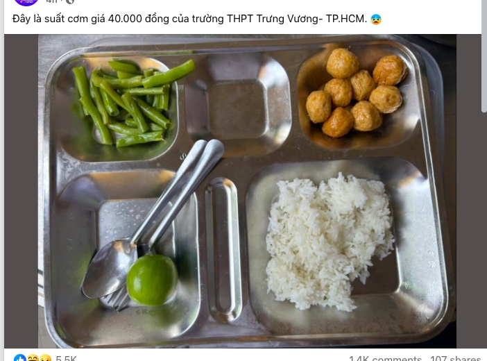 Bà Lương Bích Nga, Phó hiệu trưởng Trường THPT Trưng Vương xác nhận hình ảnh được chia sẻ là suất ăn bán trú tại trường hôm nay, tuy nhiên không phản ánh đầy đủ khẩu phần ăn của học sinh. Theo bà Nga, suất ăn bán trú tại trường gồm nhiều thành phần hơn so với hình ảnh lan truyền.