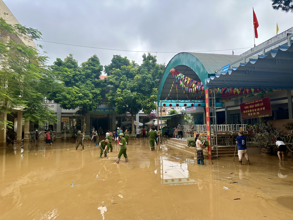 Tập thể cán bộ, giáo viên, nhân viên nhà trường huy động các ban, ngành, đoàn thể, lực lượng công an, cảnh sát cơ động, lực lượng tham gia bảo vệ an ninh trật tự ở cơ sở, phụ huynh học sinh tiến hành xịt rửa bùn đất trong khuôn viên sân trường, phòng học, lau chùi bàn ghế, vệ sinh lớp học, trang thiết bị, đồ dùng học tập bảo đảm các điều kiện tốt nhất để học sinh trở lại trường học trong thời gian sớm nhất.