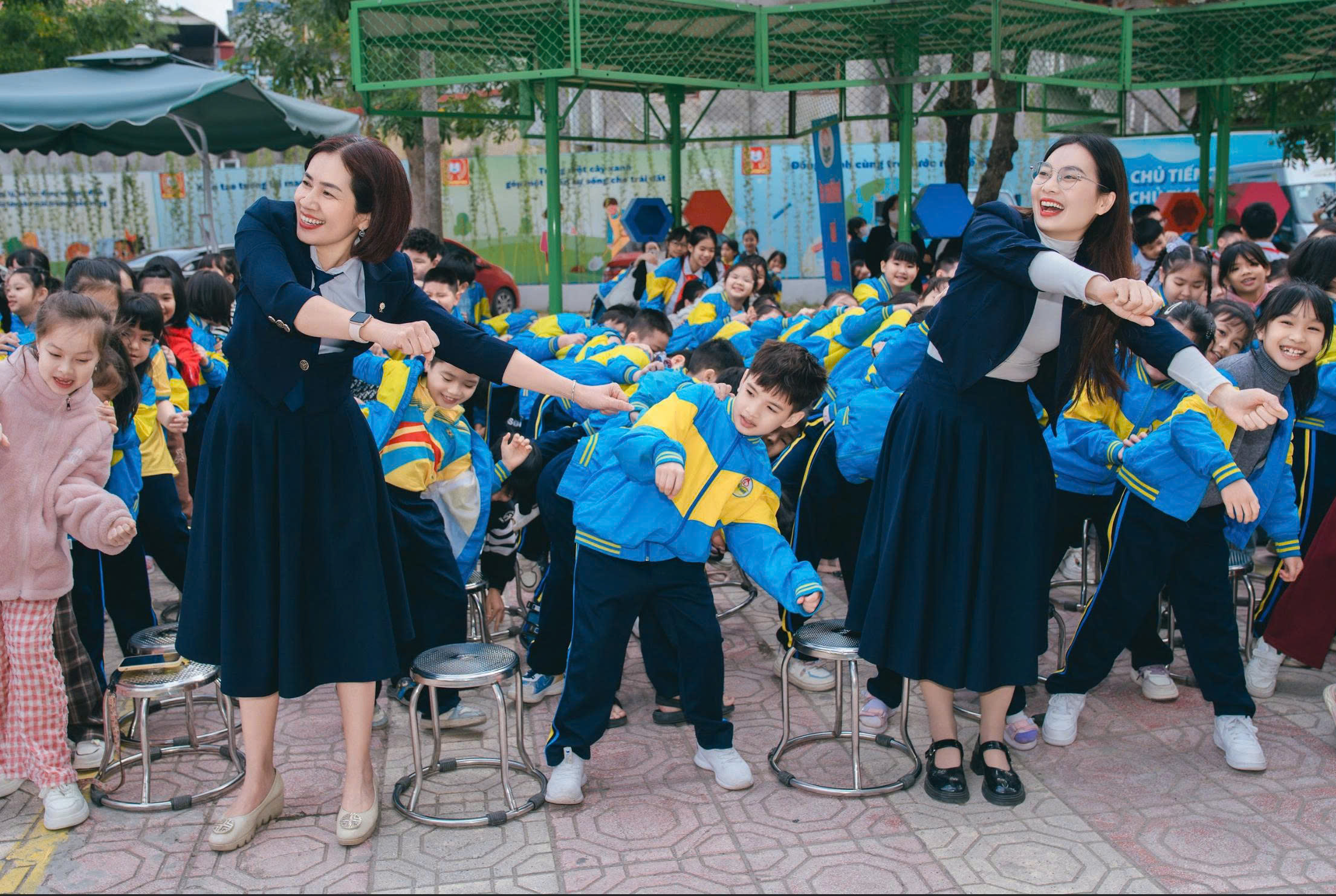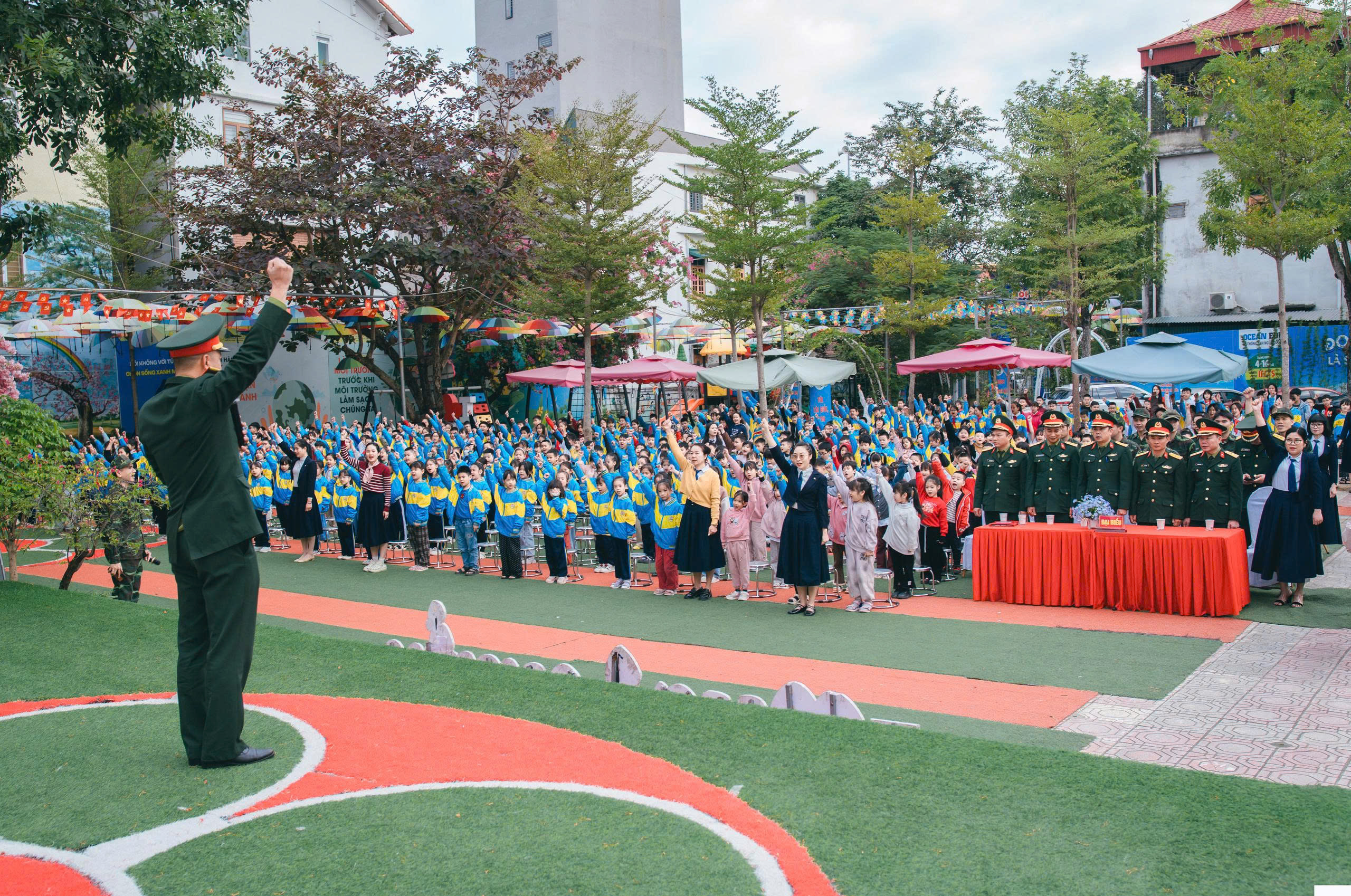 Bên cạnh đó, nhà trường còn tổ chức cho học sinh tham gia đồng diễn múa tập thể chào mừng Ngày thành lập Quân đội Nhân dân Việt Nam 22/12. Trong giai điệu hào hùng, tha thiết của ca khúc "Cháu hát về đảo xa", các em học sinh đã thể hiện những động tác múa uyển chuyển, đồng đều, gửi gắm tình yêu quê hương, biển đảo thiêng liêng của Tổ quốc và lòng biết ơn sâu sắc đối với các chú Bộ đội Cụ Hồ đang ngày đêm canh giữ bình yên đất nước.