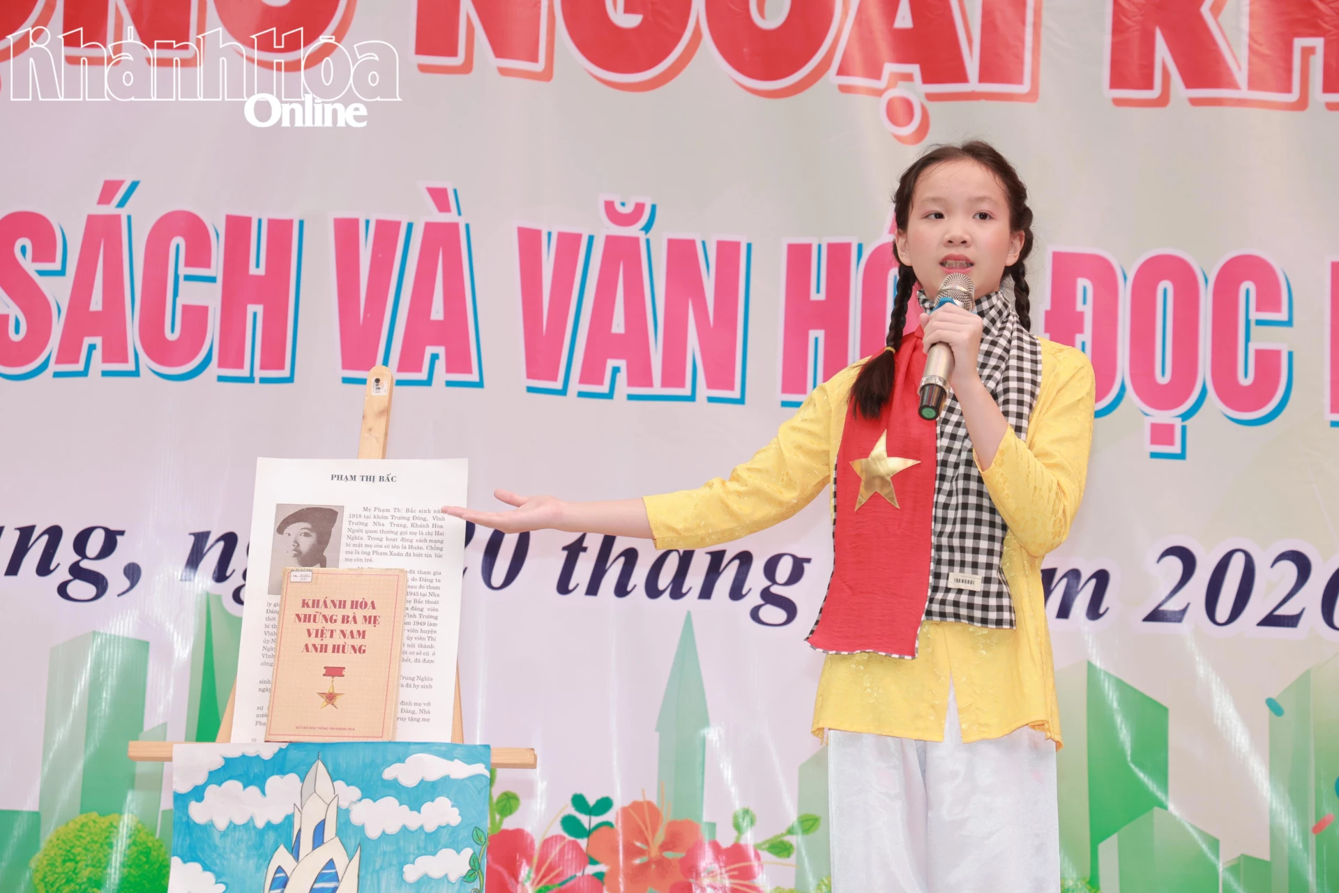 Học sinh lớp 5 giới thiệu về cuốn sách “Khánh Hòa những Bà mẹ Việt Nam anh hùng”.
