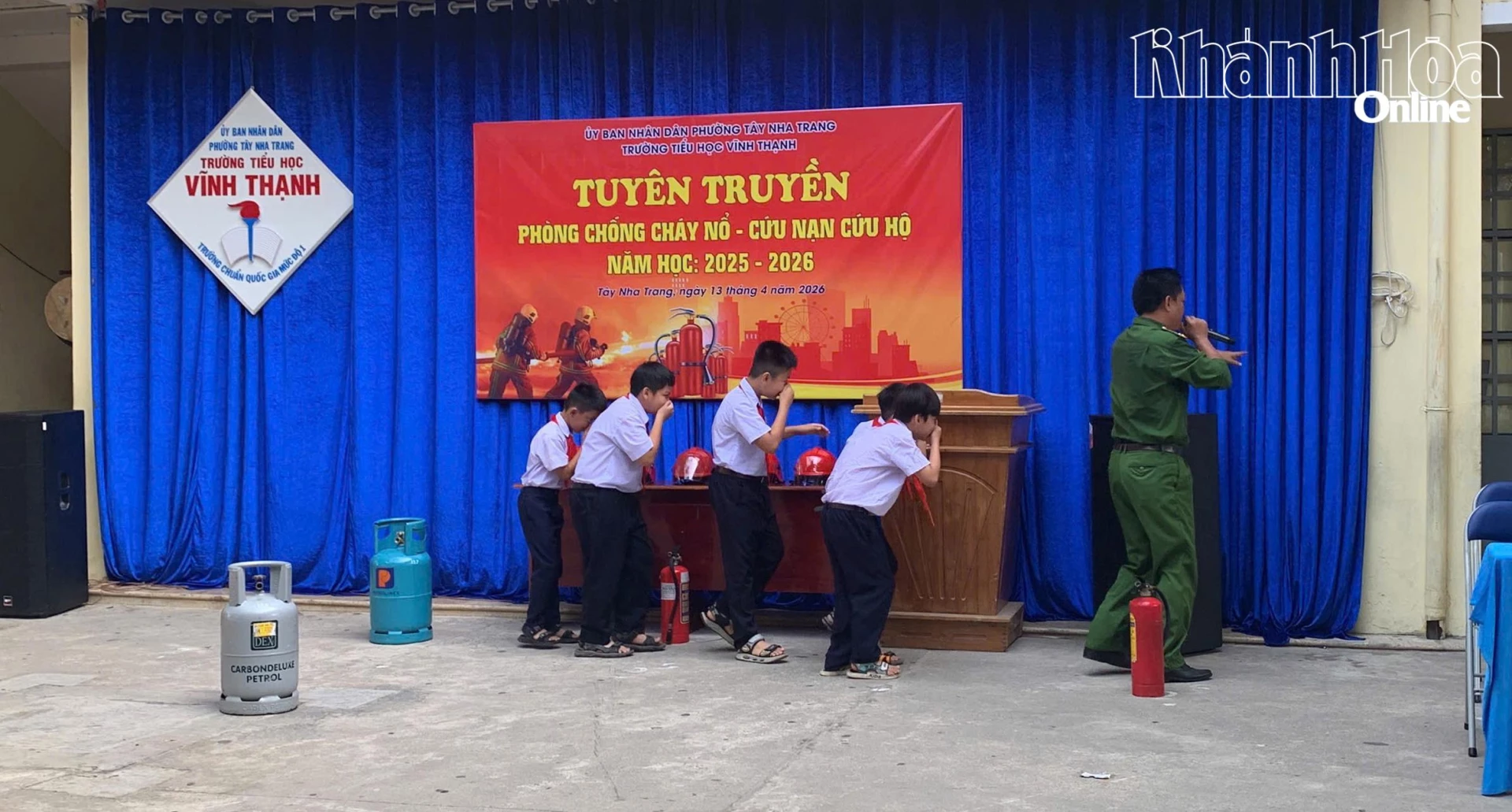 Sáng 13-4, Đội Chữa cháy và cứu nạn, cứu hộ khu vực 1 (Phòng Cảnh sát phòng cháy, chữa cháy và cứu nạn, cứu hộ - Công an tỉnh Khánh Hòa) phối hợp với Trường Tiểu học Vĩnh Thạnh (phường Tây Nha Trang) tổ chức chương trình tuyên truyền, trải nghiệm về phòng cháy, chữa cháy và cứu nạn cứu hộ cho hơn 1.400 giáo viên, học sinh của trường.