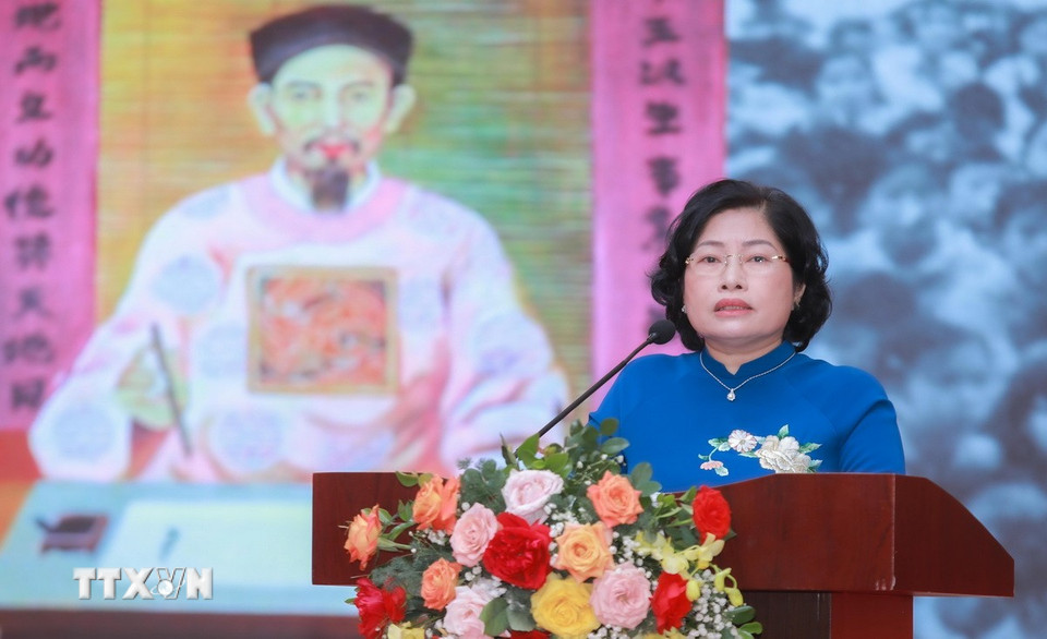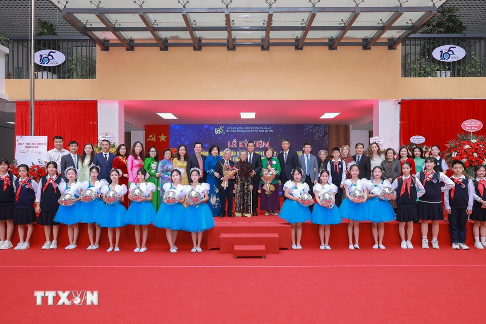 Các đại biểu và tập thể thầy cô, học sinh nhà trường tại lễ kỷ niệm. (Ảnh: Phan Phương/TTXVN)