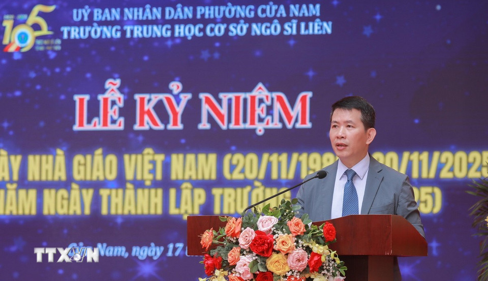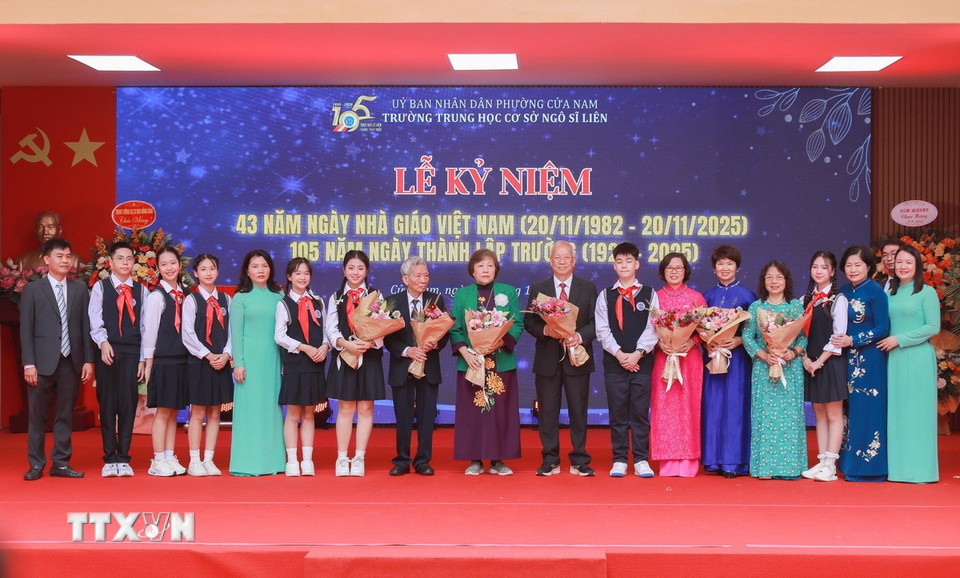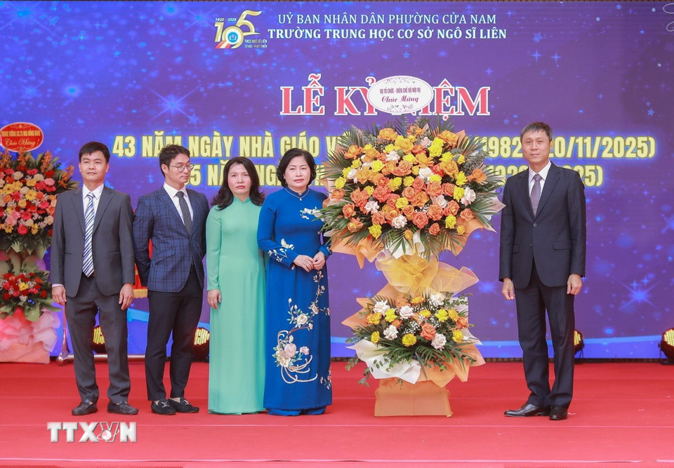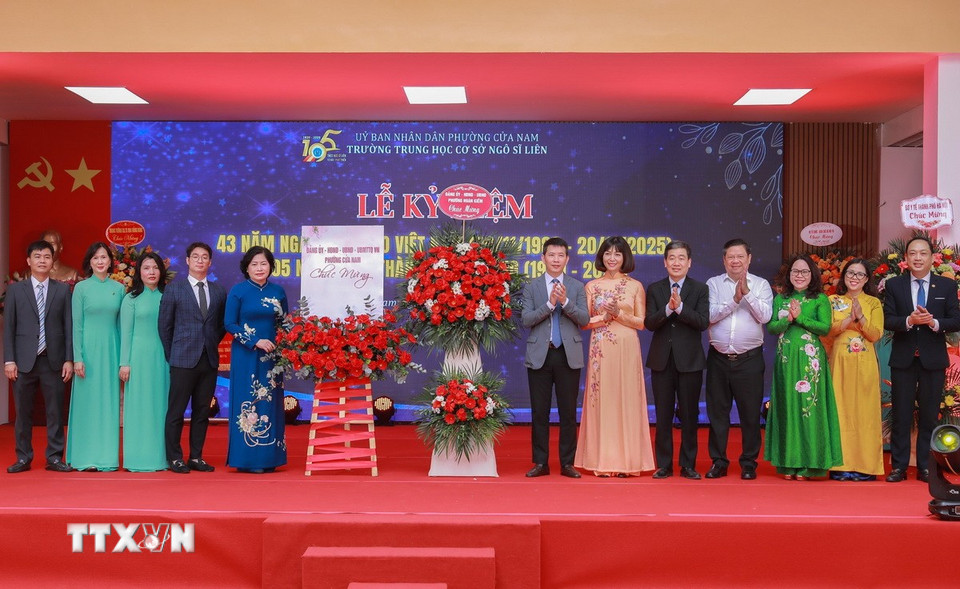 Lãnh đạo các phường Cửa Nam, Hoàn Kiếm.. tặng hoa chúc mừng tập thể nhà trường. (Ảnh: Phan Phương/TTXVN)