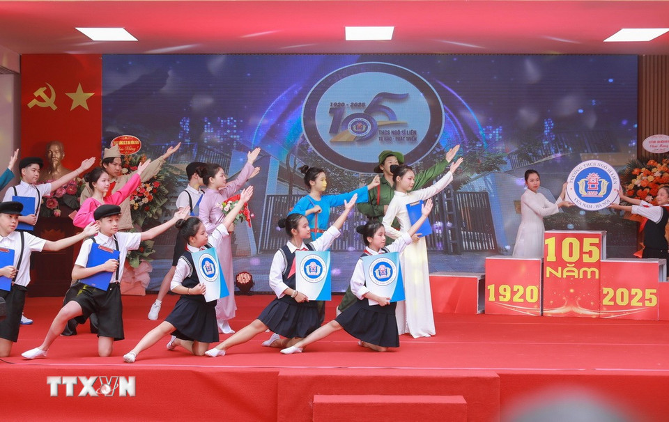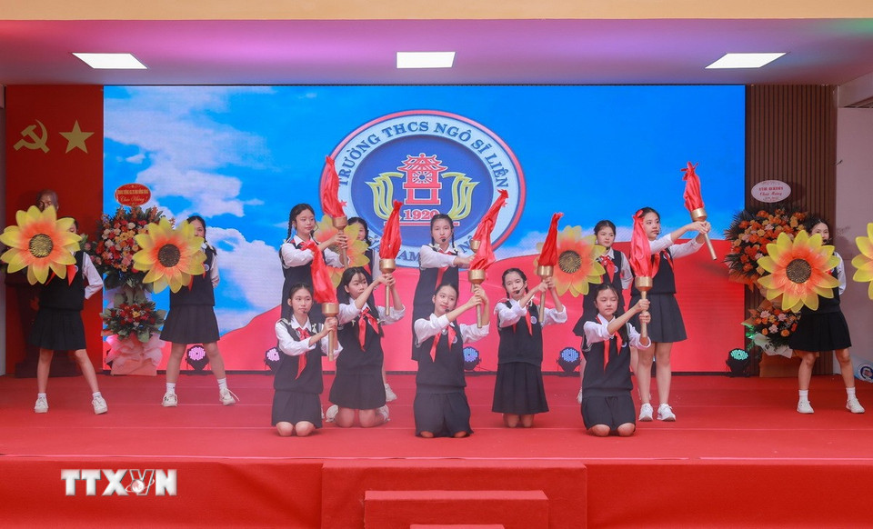 Tiết mục văn nghệ chào mừng trong lễ kỷ niệm do cán bộ, giáo viên và học sinh nhà trường thể hiện. (Ảnh: Phan Phương/TTXVN)