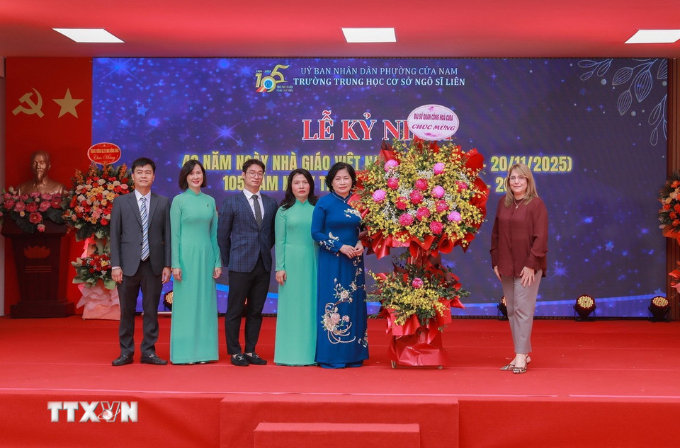 Đại diện Đại sứ quán Cuba tặng hoa chúc mừng tập thể nhà trường. (Ảnh: Phan Phương/TTXVN)