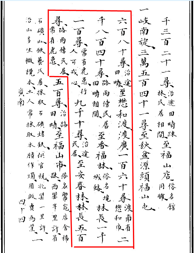 “680 tầm, dọc đường là ruộng cấy lúa, đến đò Mậu Hòa, sông rộng 160 tầm, phía nam bến đò có chợ Mậu Hòa. 2840 tầm, hai bên đường đều có dân cư và ruộng cấy lúa xen nhau, đến rừng Hương Phước, tục gọi là truông Vực Rắn. Rừng dài 1.100 tầm, thường có cọp beo, khách đi đường phải lưu ý. 9.010 tầm, dọc đường có dân cư, đến rừng An Xuân, rừng dài 500 tầm, hai bên đường có dân cư, cũng thường sợ nạn cọp beo”.