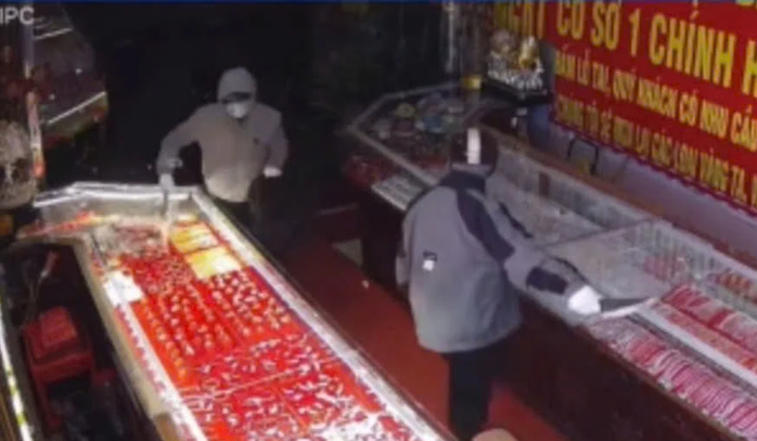 Qua hình ảnh camera an ninh cho thấy, một đối tượng mặc áo màu đen xám cầm dao đi vào trước để cảnh giới, đối tượng còn lại dùng búa đập vỡ tủ kính, vơ vét vòng vàng, trang sức bỏ vào ba lô mang rồi nhanh chóng ra xe máy tháo chạy.