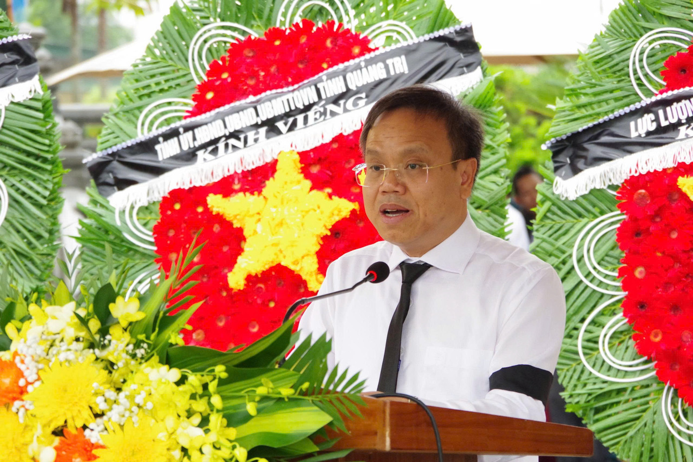 Ông Lê Đức Tiến - Phó Chủ tịch UBND tỉnh, Trưởng Ban Chỉ đạo 515 tỉnh Quảng Trị đọc điếu văn tại Lễ truy điệu.
