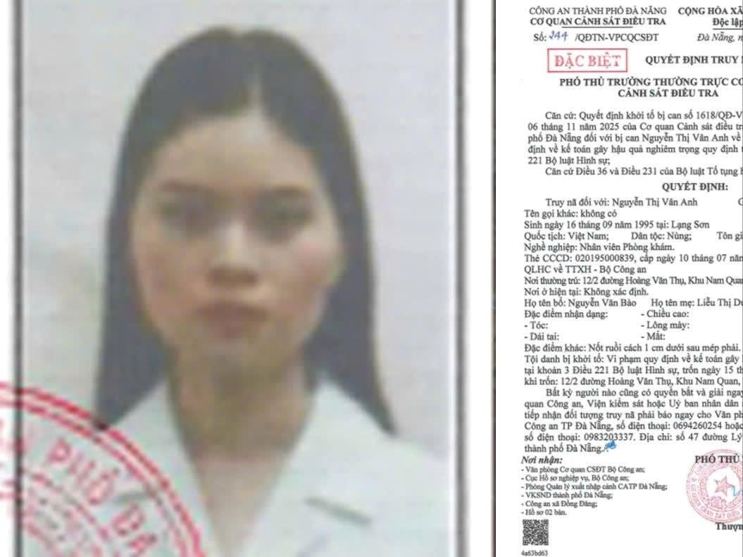 Cụ thể, Cơ quan Cảnh sát điều tra Công an thành phố Đà Nẵng ra quyết định truy nã “đặc biệt” đối với Nguyễn Thị Vân Anh (sinh năm 1995), trú xã Đồng Đăng, tỉnh Lạng Sơn – là đối tượng giữ vai trò Kế toán của Phòng khám, cũng là người trực tiếp thực hiện và tham gia giúp sức trong việc quản lý sổ sách kế toán trái quy định, hợp thức hóa các khoản thu chi bất hợp pháp.