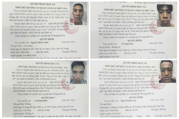 Theo đó, 4 đối tượng bị truy nã gồm: Võ Ngọc Sơn (SN 2006, cư trú: ấp Kinh Tràm, xã Hòa Hưng, tỉnh An Giang); Bạch Thanh Lên (SN 1999, cư trú: ấp Trung Hóa, xã Trường Xuân, TP Cần Thơ); Nguyễn Minh Luân (SN 1992, cư trú: ấp Ngọc An, xã Ngọc Chúc, tỉnh An Giang) và La Hoàng Hôn (SN 1999, cư trú: ấp Thắng Lợi, xã Vĩnh Thạnh, TP Cần Thơ) về tội “Trốn khỏi nơi giam giữ”.