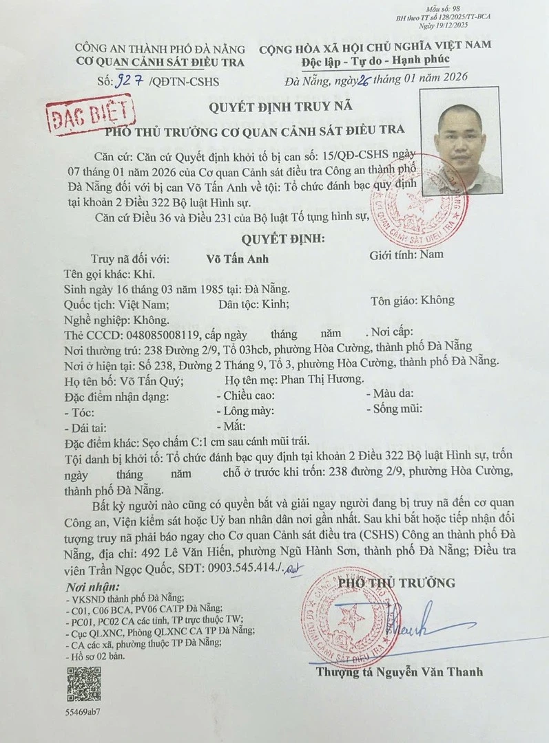 Cơ quan Cảnh sát điều tra Công an thành phố Đà Nẵng vừa ra quyết định truy nã loại đặc biệt đối với Võ Tấn Anh (31 tuổi), trú phường Hòa Cường, thành phố Đà Nẵng. Đây là đối tượng cầm đầu đường dây đánh bạc và tổ chức đánh bạc bằng hình thức cá độ bóng đá hoạt động liên tỉnh với 48 đối tượng liên quan.