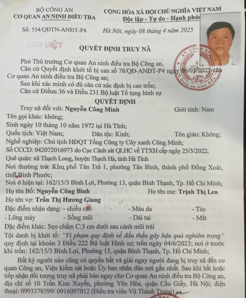 Căn cứ kết quả điều tra, ngày 6/3/2025 Cơ quan ANĐT, Bộ Công an đã ra Quyết định khởi tố bị can số 78/QĐ-ANĐT-P4, đồng thời ngày 8/4/2025 ra Quyết định truy nã số 534/QĐTN-ANĐT-P4 đối với: Nguyễn Công Minh; sinh ngày 10/10/1972 tại Hà Tĩnh; nghề nghiệp: Chủ tịch Hội đồng quản trị Tổng Công ty Cây xanh Công Minh; Số CCCD: 042072016973 do Cục Cảnh sát QLHC về TTXH Bộ Công an cấp ngày 25/3/2022; Nơi thường trú: Khu phố Tân Trà 1, phường Tân Bình, thành phố Đồng Xoài, tỉnh Bình Phước (nay thuộc phường Bình Phước, tỉnh Đồng Nai).