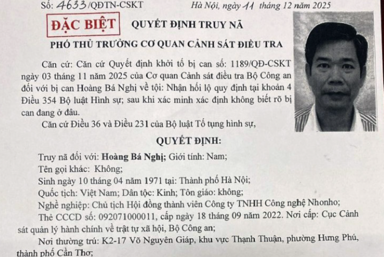 Căn cứ khoản 1 Điều 231 Bộ luật Tố tụng hình sự 2015, ngày 11/12/2025, Cơ quan CSĐT Bộ Công an đã ban hành quyết định truy nã đặc biệt nguy hiểm đối với bị can Hoàng Bá Nghị. C03 đề nghị các cơ quan, tổ chức, cá nhân trên toàn quốc khi phát hiện đối tượng phải kịp thời báo tin hoặc áp dụng biện pháp bắt giữ theo quy định pháp luật.