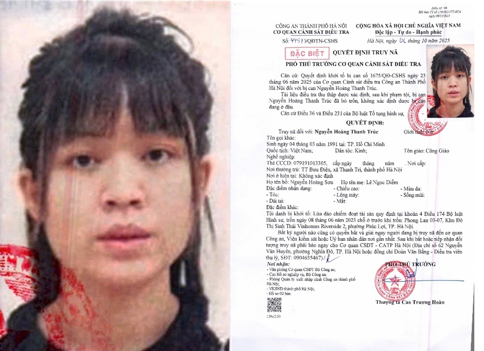 Đến ngày 06/10/2025, Cơ quan CSĐT Công an TP Hà Nội tiếp tục ban hành quyết định truy nã đối với Nguyễn Hoàng Thanh Trúc.