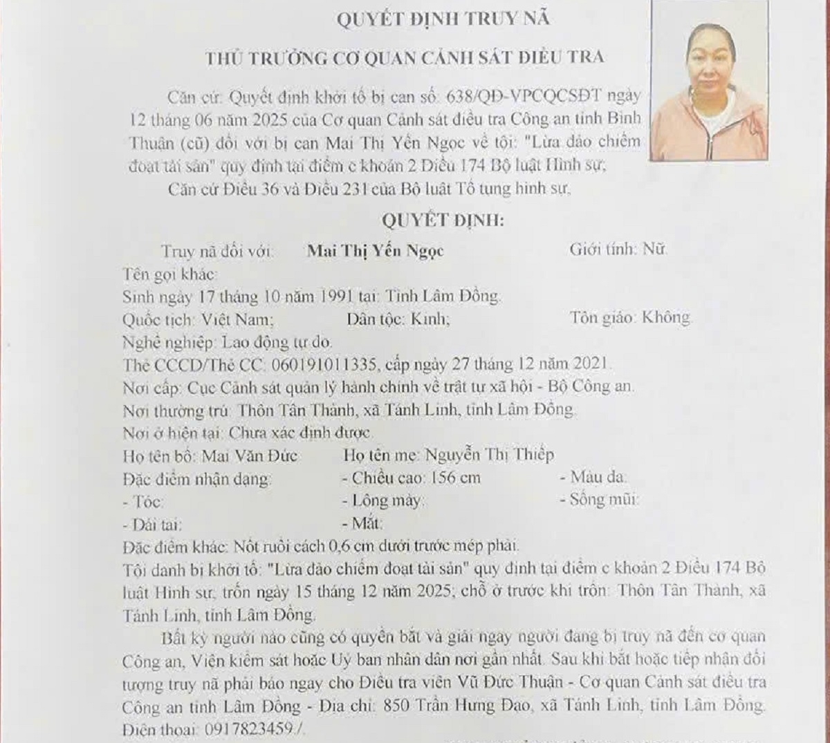 Ngày 16/2, Cơ quan Cảnh sát điều tra Công an tỉnh Lâm Đồng cho biết, đã ra quyết định truy nã toàn quốc đối với Mai Thị Yến Ngọc (35 tuổi, ngụ thôn Tân Thành, xã Tánh Linh, tỉnh Lâm Đồng - Khu vực huyện Tánh Linh, tỉnh Bình Thuận cũ) về tội lừa đảo chiếm đoạt tài sản.