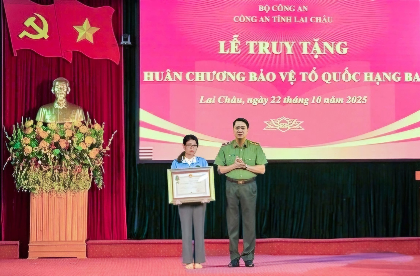 Thừa ủy quyền của Chủ tịch nước, thiếu tướng Nguyễn Viết Giang, Giám đốc Công an tỉnh Lai Châu đã trao Huân chương bảo vệ Tổ quốc hạng ba cho đại diện gia đình thiếu tá Hà Văn Minh. Ảnh: Công an tỉnh Lai Châu.