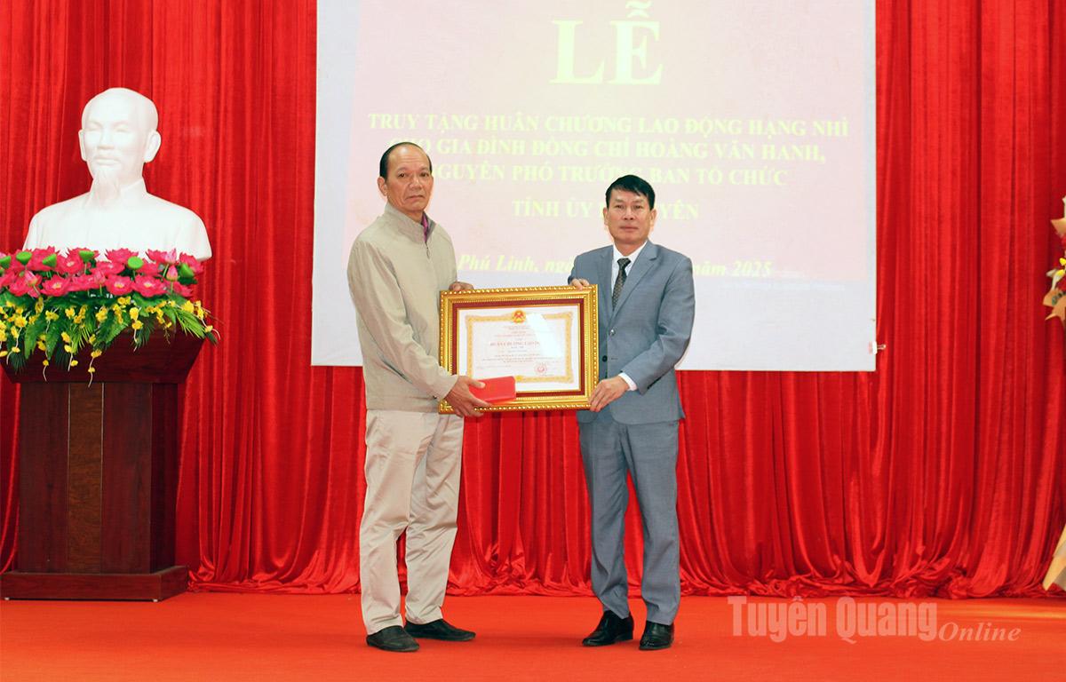 Đồng chí Đỗ Văn Hùng, Ủy viên BCH Đảng bộ tỉnh, Phó Trưởng ban Thường trực Ban Tổ chức Tỉnh ủy trao Huân chương lao động hạng Nhì cho thân nhân gia đình đồng chí Hoàng Văn Hanh.