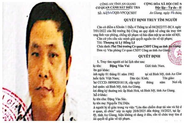 Hiện, không rõ Vui đang ở đâu, cần tổ chức truy tìm để phục vụ công tác giải quyết tin báo về tội phạm, Cơ quan Cảnh sát điều tra Công an tỉnh An Giang đề nghị cá nhân, cơ quan, tổ chức biết thông tin về đối tượng Vui thông báo ngay cho Cơ quan Cảnh sát điều tra Công an tỉnh An Giang (địa chỉ: Số 63, Phan Đình Phùng, phường Châu Đốc, tỉnh An Giang) gặp Điều tra viên Huỳnh Văn Trọng, số điện thoại:0962.999.967 hoặc Cơ quan Công an nơi gần nhất.