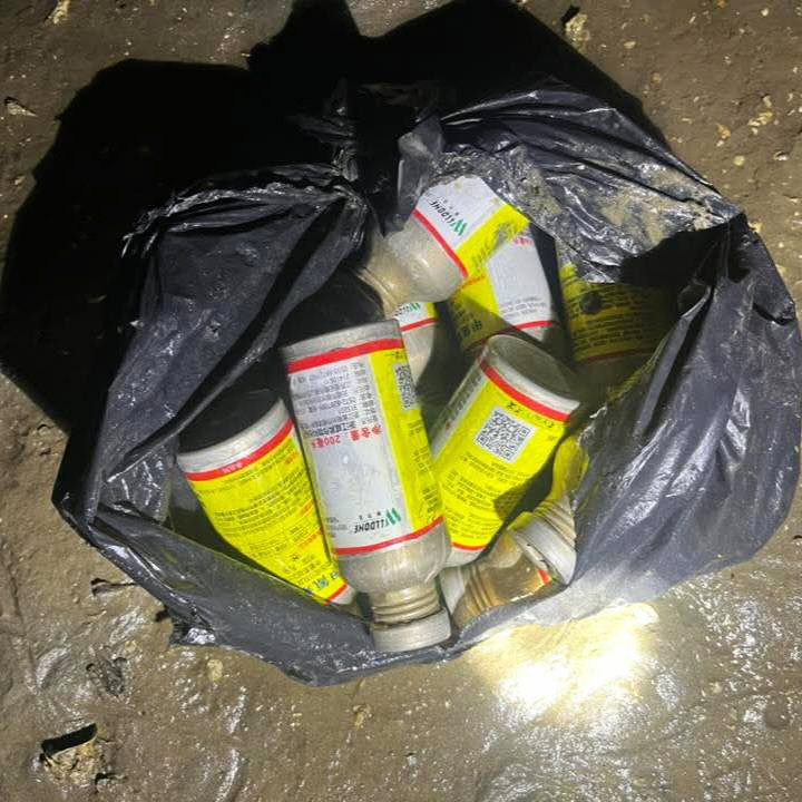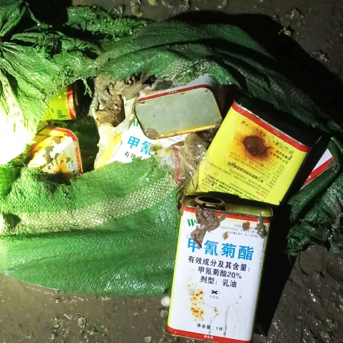 Gần đó là những chai lọ hóa chất không rõ nguồn gốc với chữ Trung Quốc vẫn còn vương lại hiện trường.