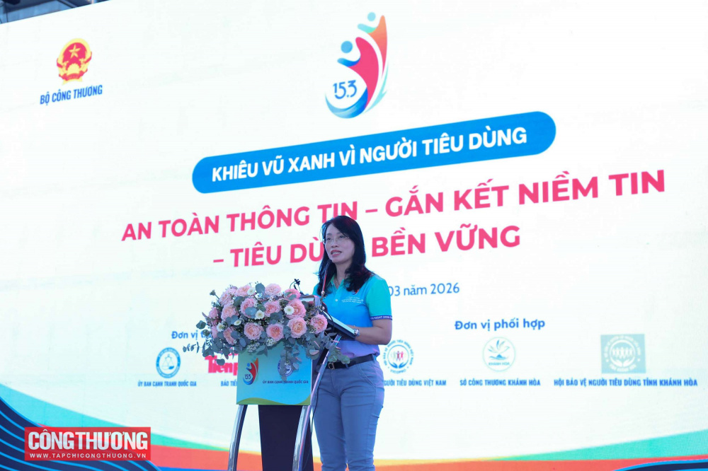 Phát biểu khai mạc Chương trình, bà Nguyễn Quỳnh Anh - Phó Chủ tịch Ủy ban Cạnh tranh Quốc gia (Bộ Công Thương) cho biết, Chương trình “Khiêu vũ xanh vì người tiêu dùng” là một trong số những hoạt động nằm trong khuôn khổ chuỗi sự kiện hưởng ứng Ngày Quyền của người tiêu dùng năm 2026 do Bộ Công Thương triển khai với chủ đề “An toàn thông tin - Gắn kết niềm tin - Tiêu dùng bền vững” tại Nha Trang (Khánh Hòa) - địa phương có trung tâm du lịch - dịch vụ lớn, có sức lan tỏa mạnh về lối sống, lối tiêu dùng an toàn, văn minh; phù hợp với thông điệp của Chủ đề là bảo đảm an toàn, bảo mật thông tin cho người tiêu dùng trong bối cảnh kinh tế số, gắn kết Nhà nước - Doanh nghiệp - Người tiêu dùng, khuyến khích sản xuất và tiêu dùng có trách nhiệm, xanh và bền vững.