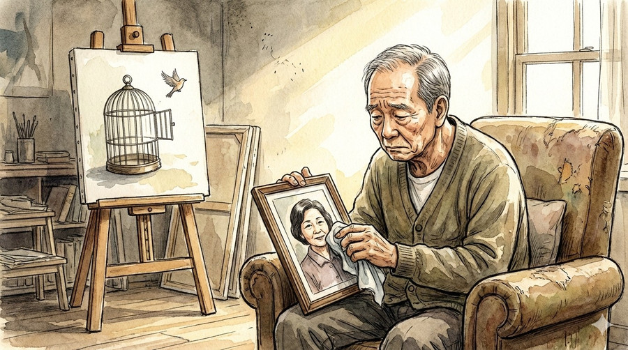 Trong góc tối nhất của ngăn kéo, chiếc hộp nhỏ đựng lông chim màu nâu xám vẫn nằm đó – thứ mà bà nhặt được trong buổi sáng cuối cùng trước khi vào viện. Ông áp nó lên má, tưởng tượng ra hơi ấm từ bàn tay vợ vẫn còn lưu lại.