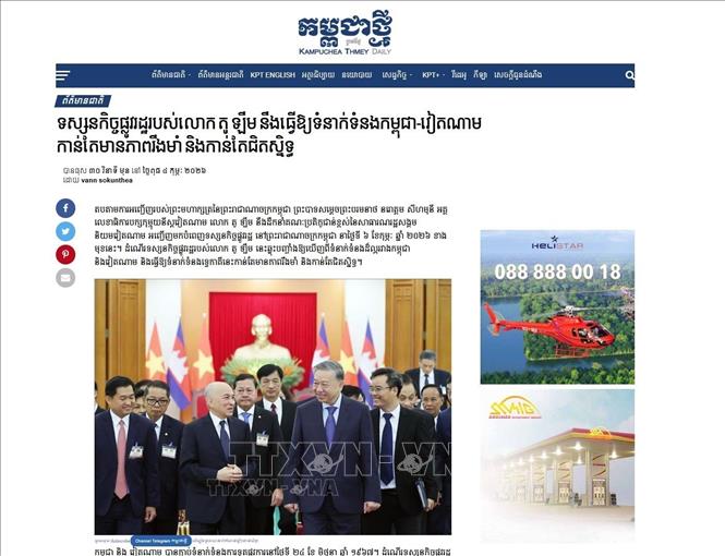 Nhật báo “Kampuchea Thmey Daily” ngày 4/2/2026 đăng tải bài viết với tiêu đề “Chuyến thăm cấp nhà nước của ông Tô Lâm sẽ làm cho quan hệ Campuchia - Việt Nam càng thêm vững mạnh và gắn bó hơn”. Ảnh: TTXVN phát