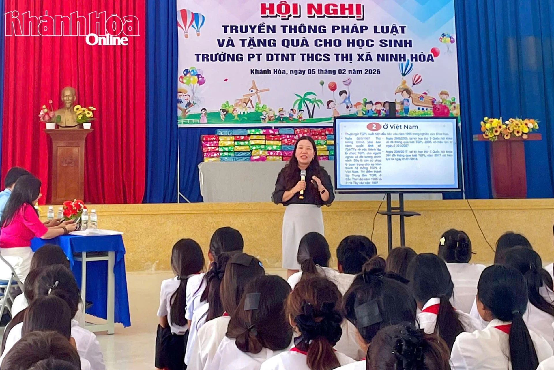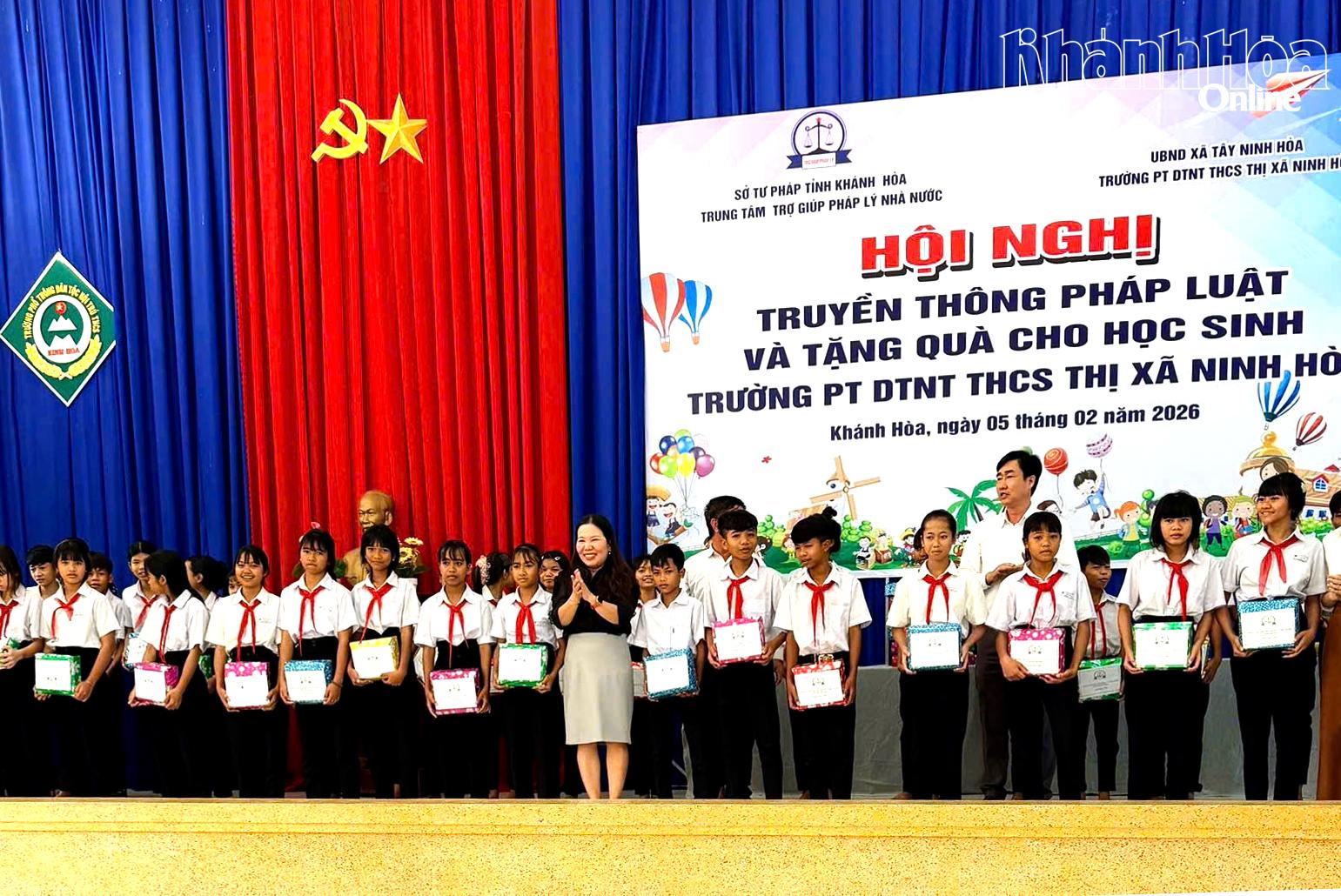 Lãnh đạo Trung tâm Trợ giúp pháp lý Nhà nước tỉnh Khánh Hòa trao quà cho học sinh.