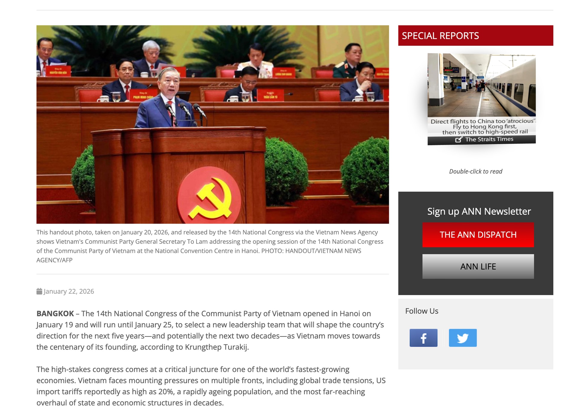 Bản tin ngày 22-1 của Asia News Network dẫn ý kiến các nhà phân tích cho rằng, Đại hội XIV là "tín hiệu quan trọng về định hướng chính sách tương lai của Việt Nam" trong một môi trường toàn cầu đang thay đổi nhanh chóng.