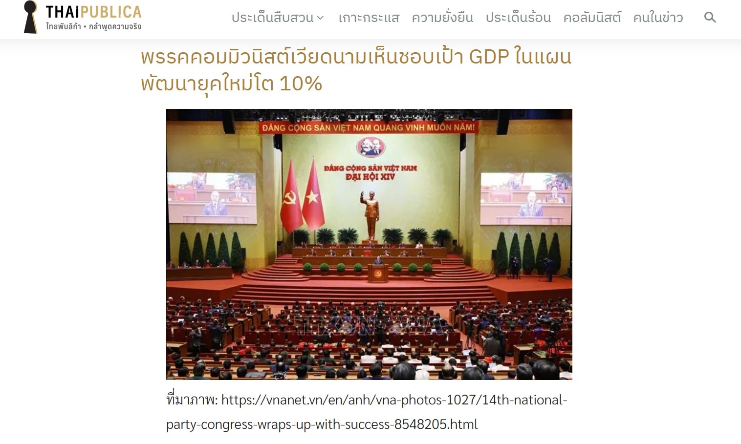 Báo Thaipublica đăng bài với tiêu đề “Đại hội đại biểu toàn quốc lần thứ XIV của Đảng Cộng sản Việt Nam: Bước ngoặt đưa đất nước bước vào kỷ nguyên mới”, khẳng định Đại hội XIV là một “bước ngoặt chiến lược” trong tiến trình hiện đại hóa được hoạch định bài bản, mang tầm nhìn dài hạn của Việt Nam.