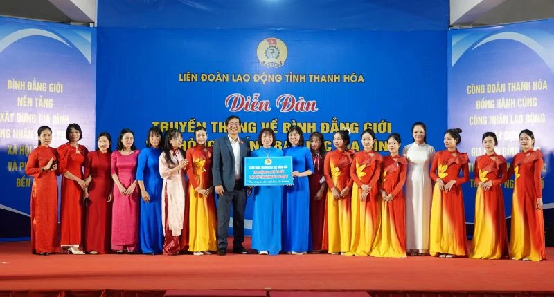 Đại diện Công đoàn Trường Đại học Hồng Đức trao tặng 50 bộ áo dài cho nữ công nhân lao động.