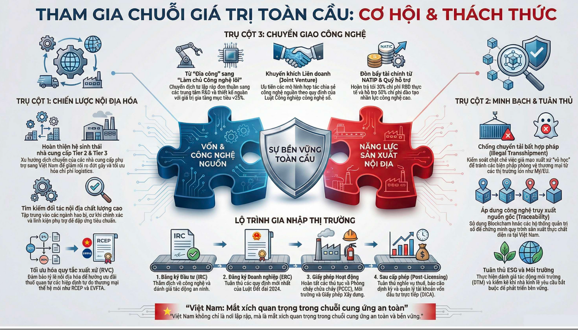 Về tài chính, trước tác động của Thuế tối thiểu toàn cầu (GMT) 15%, các ưu đãi thuế truyền thống không còn hiệu quả với doanh nghiệp có doanh thu trên 750 triệu EUR. Thay vào đó, Việt Nam áp dụng cơ chế hoàn trả chi phí thực tế, tập trung vào các danh mục trọng tâm như R&D (hỗ trợ tới 30%), đào tạo nhân lực (tới 50%), hạ tầng xã hội và đầu tư tài sản cố định công nghệ cao.