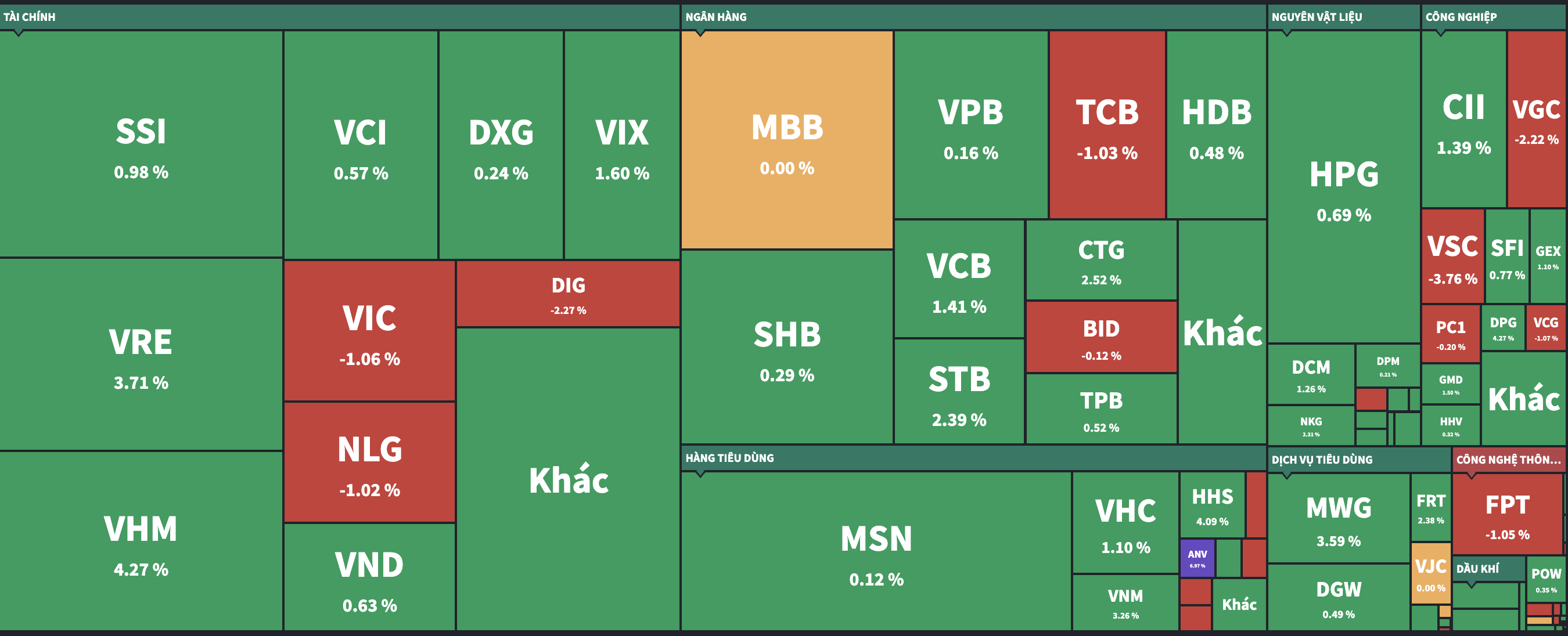 Tuy các cổ phiếu chứng khoán, tài chính đã xanh giá trở lại vào những phút cuối ngày song vẫn chưa phải là động lực tăng giá chính trong phiên ngày hôm nay. Thành tố nổi bật trong ngày phải kể đến sự đóng góp của VHM và các cổ phiếu nhóm tiêu dùng như MWG, VNM. Trong khi VN30 tăng 0,7%, nhóm chỉ số cổ phiếu tiêu dùng là VNCOND và tiêu dùng thiết yếu VNCONS đã tăng lần lượt 2,32% và 1,27%.