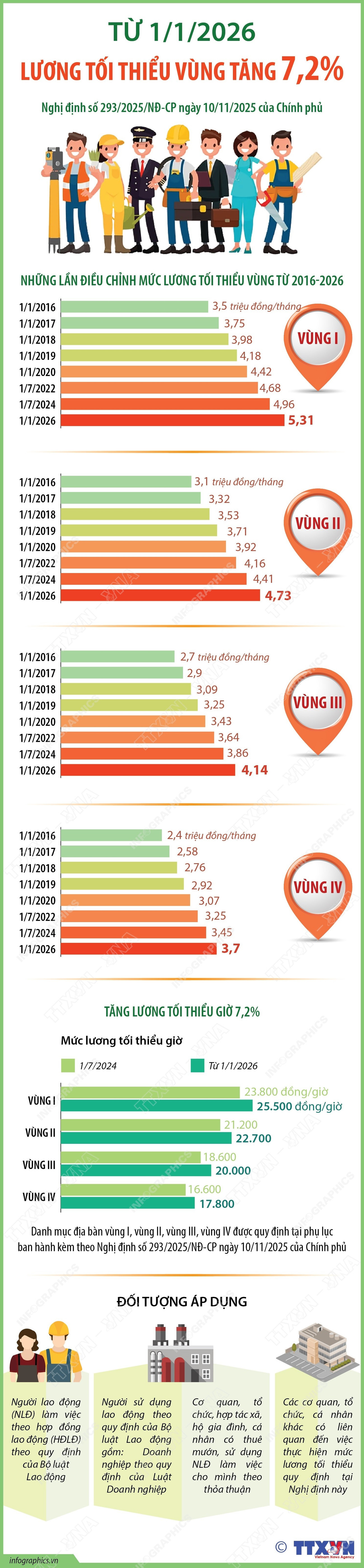 Theo quy định tại Nghị định số 293/2025/NĐ-CP ban hành ngày 10/11/2025 của Chính phủ, từ 1/1/2026 mức lương tối thiểu đối với người lao động làm việc theo hợp đồng lao động tăng từ 250.000 đồng- 350.000 đồng/tháng (tương ứng tỷ lệ tăng bình quân 7,2%).