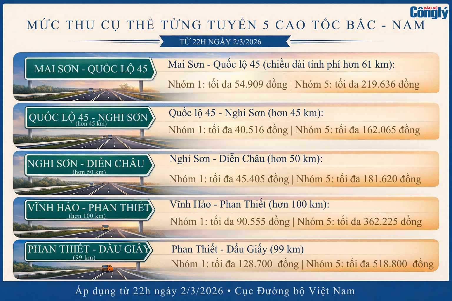Theo thông tin từ Cục Đường bộ Việt Nam, các tuyến cao tốc bắt đầu thu phí gồm: Mai Sơn - Quốc lộ 45; Quốc lộ 45 - Nghi Sơn; Nghi Sơn - Diễn Châu; Vĩnh Hảo - Phan Thiết; và Phan Thiết - Dầu Giây.