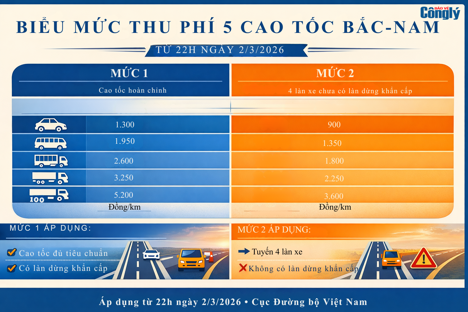 Năm tuyến cao tốc do Nhà nước đầu tư sẽ áp dụng 2 mức thu phí/km tương ứng với điều kiện hạ tầng, chia theo 5 nhóm phương tiện.