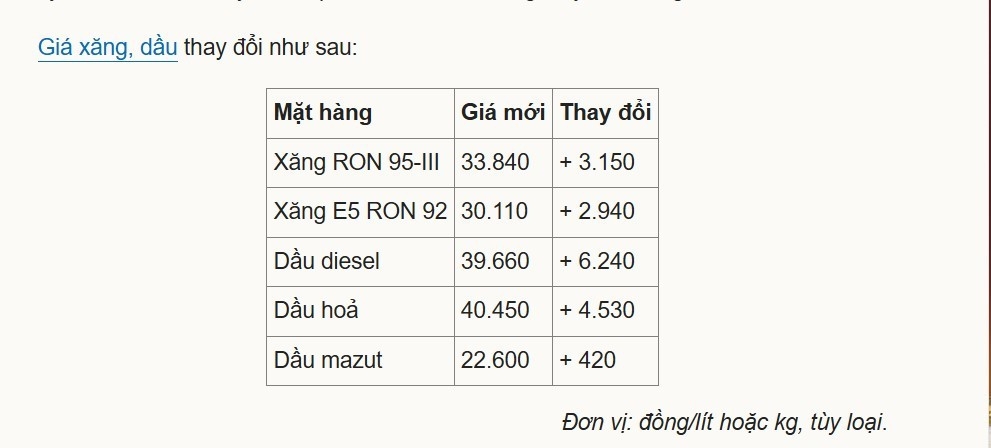Đối với các mặt hàng dầu (trừ mazut), giá cũng tăng từ 2.080 đến 6.240 đồng mỗi lít tùy loại. Sau điều chỉnh, giá dầu diesel đạt 39.660 đồng/lít, trong khi dầu hỏa ở mức 40.450 đồng/lít.