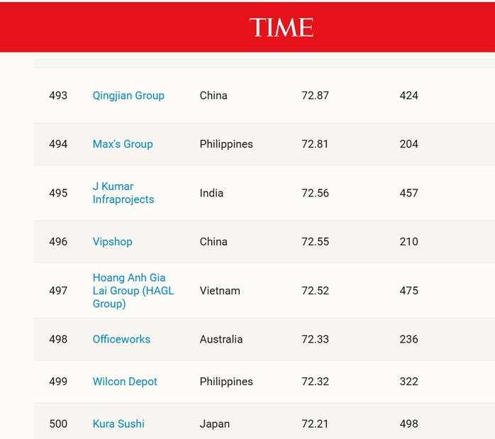 9 công ty Việt Nam được vinh danh trong bảng xếp hạng các công ty tốt nhất khu vực châu Á - Thái Bình Dương năm 2026 của tạp chí TIME và Tập đoàn HAGL xếp hạng 497