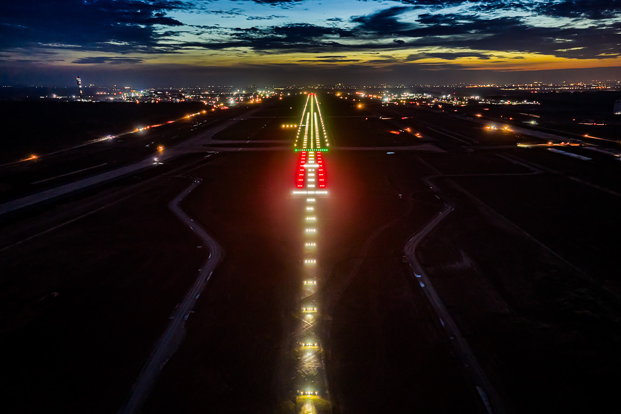 Đường cất hạ cánh số 1 sáng đèn, sẵn sàng đón chuyến bay kỹ thuật đầu tiên.