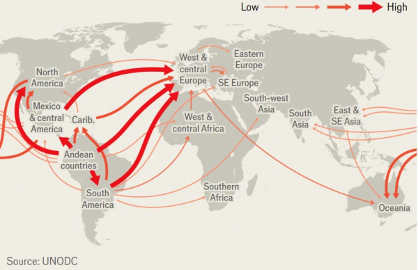 Dòng chảy ma túy từ Nam Mỹ đang chuyển hướng nhiều hơn tới châu Âu. Đồ họa: UNODC.